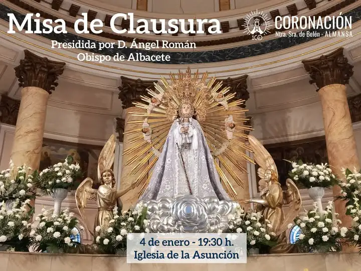 El acto de clausura tendrá lugar el domingo 4 de enero, a las 19:30 h, con la celebración de la Eucaristía en la Iglesia de la Asunción, presidida por D. Ángel Román, obispo de Albacete, y concelebrada por los sacerdotes de Almansa.