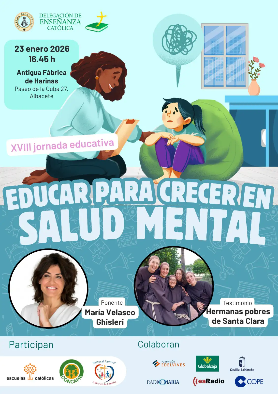 La Delegación de Enseñanza Católica de la Diócesis de Albacete celebra el próximo 23 de enero de 2026 la XVIII Jornada Educativa, bajo el lema “Educar para crecer en salud mental”, una propuesta formativa que busca ofrecer claves y reflexiones para acompañar el crecimiento integral de niños y jóvenes desde el ámbito educativo y familiar.